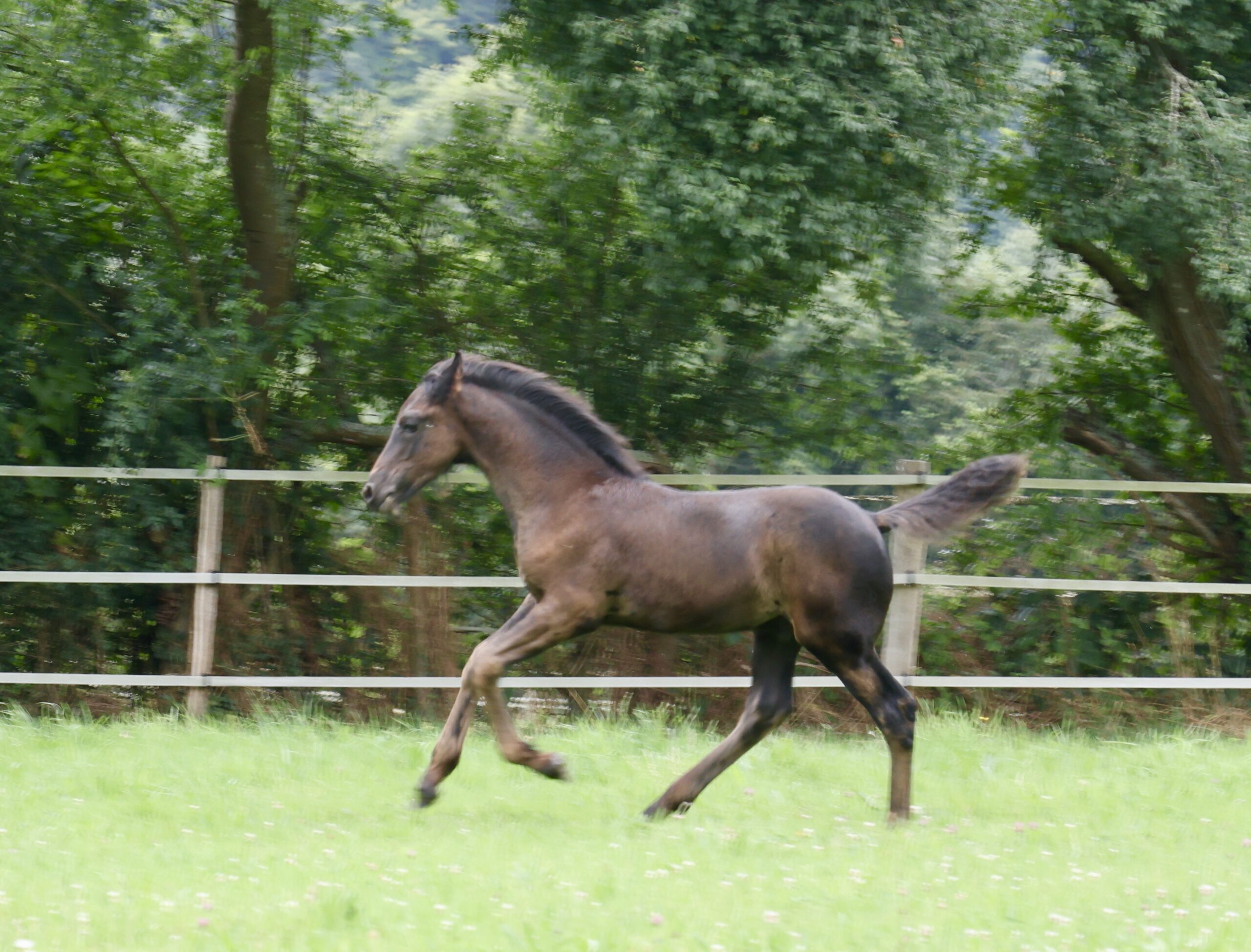 Des allures magnifiques, allongements spectaculaires, rebond, legereté, énormement de chic pour ce poulain, propre frére de Himalaya, et un adorable poulain (qui a mué et est aujourd’hui bien noir)